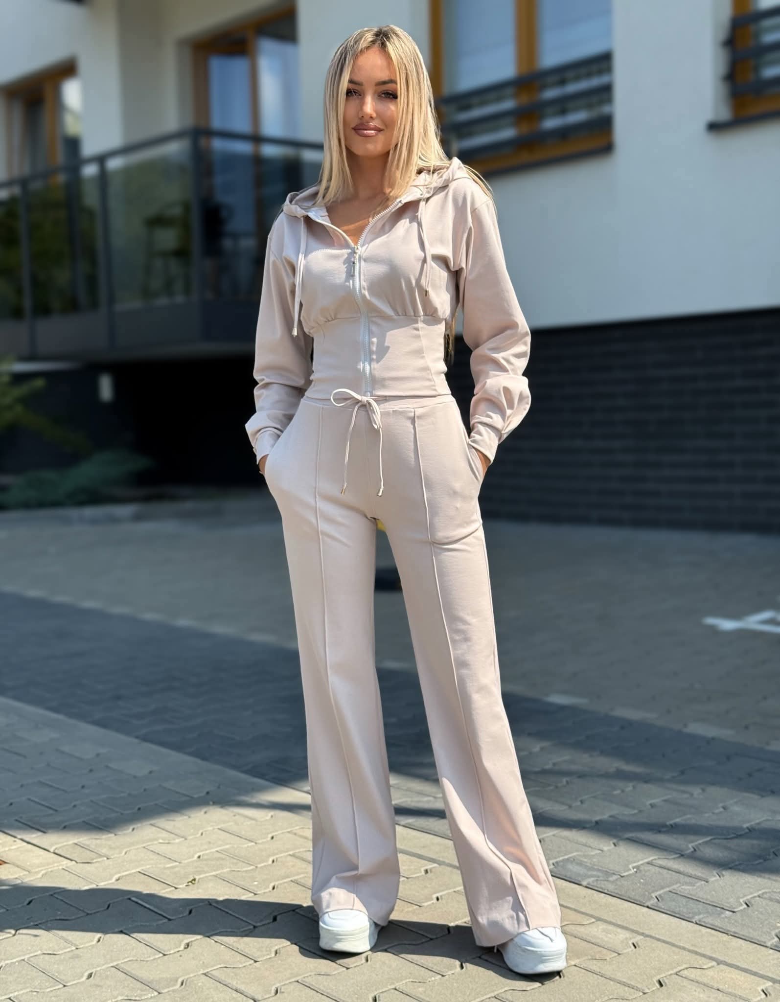 Komplet dresowy AMALFII to połączenie komfortu, jakości i modnego wyglądu.Zestaw w eleganckim, jasnobeżowym kolorze, który idealnie wpisuje się w aktualne trendy i świetnie sprawdzi się w codziennych stylizacjach. To propozycja dla kobiet, które cenią wygodę, ale nie chcą rezygnować ze stylu.