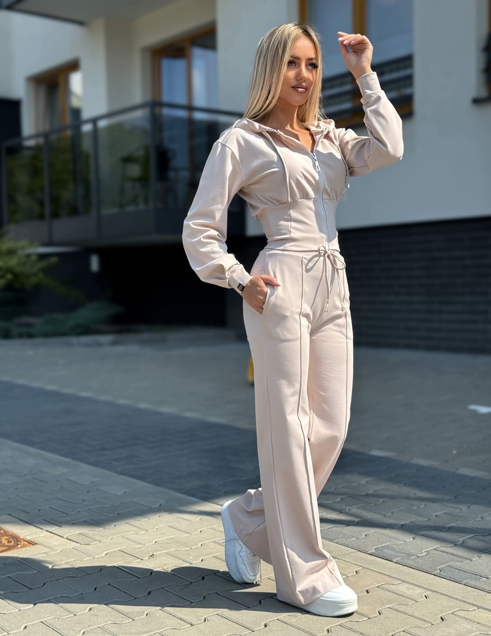 Na zdjęciach widoczny jest komplet w kolorze jasnobeżowym – uniwersalnym i łatwym do stylizacji. To idealna propozycja dla kobiet, które szukają modnego dresu premium do swojej garderoby.