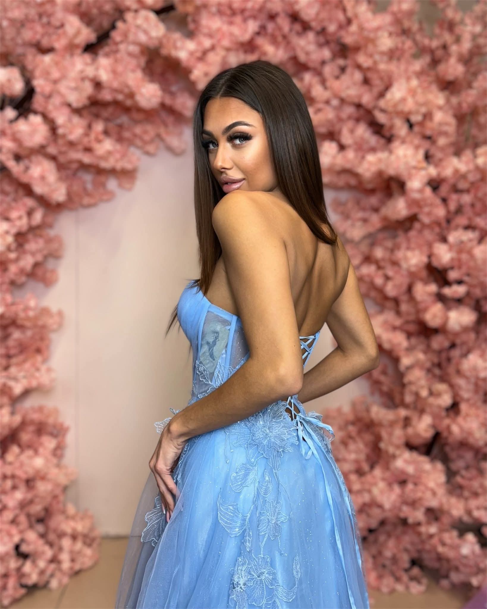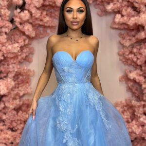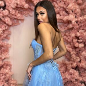 Zjawiskowa i niezwykle kobieca sukienka POSITANO PREMIUM w odcieniu baby blue to propozycja, która zachwyca lekkością i elegancją. Na zdjęciach widać dopracowaną gorsetową górę pięknie podkreślającą talię i biust oraz subtelne aplikacje kwiatów 3D, które nadają sukni romantycznego charakteru.