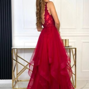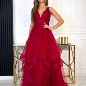 Klasyczna, elegancka i niezwykle efektowna – ORIANA PREMIUM w bordowym kolorze to suknia stworzona na wyjątkowe okazje. Idealna na wesele, bal czy wieczorne przyjęcie. Koronkowa góra zdobiona cyrkoniami pięknie podkreśla dekolt i talię, a rozłożysty dół z tiulowych falban nadaje stylizacji lekkości oraz spektakularnego efektu w ruchu.